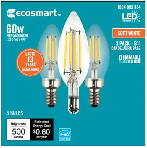 • EcoSmart Bulbs 60-Watt Equivalent B11 Dimmable Energy Star Clear Glass Candelabra LED Vintage Edison Light Bulb Soft White (3-Pack)