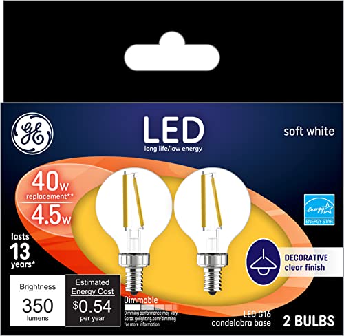 • GE Lighting 24535 Clear Finish Light Bulb Dimmable LED Daylight Decorative G16.5 Globe 4 (40-Watt Replacement), 350-Lumen Candelabra Base, 2 Count (Pack of 1)